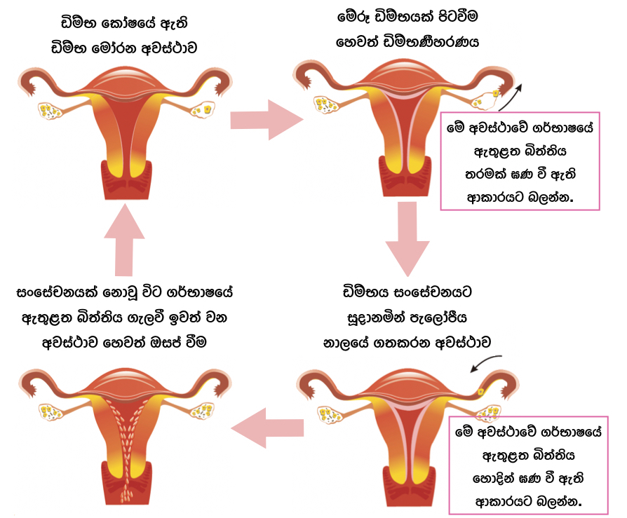 ස්ත්රී ප්රජනන පද්ධතියේ තිබෙන ඩිම්භ කෝෂ වලින් මේරූ ඩිම්භයක් පිටවී එය පැලෝපීය නාලය දිගේ ගර්භාෂය දෙසට පැමිණෙනවා. මෝරා ඇති ඩිම්භය මගින් ගැබ් ගැනීමක් ඇති වීමට ඉඩ ඇති නිසා රුධිර වාහිනී වලින් පිරී ඇති ගර්භාෂයේ බිත්ති පටලය ඝණව වැඩෙනවා. මේ බිත්ති පටලය හදුන්වන්නේ එන්ඩෝමෙට්රියම නමින්.