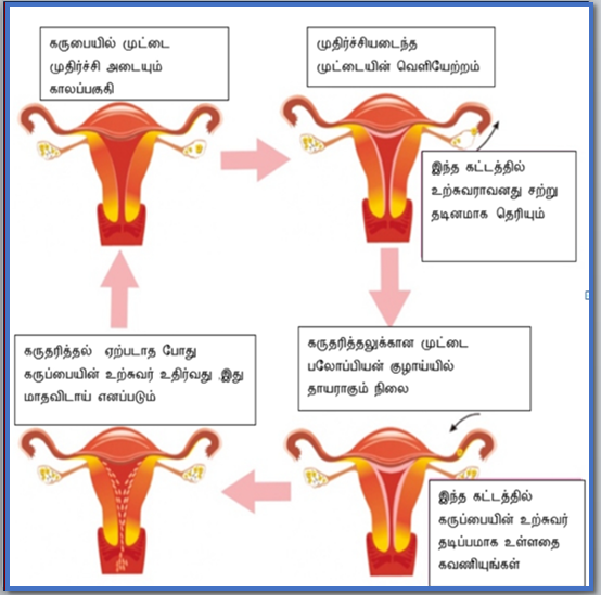 பெண் இனப்பெருக்க அமைப்பில் உள்ள கருப்பைகளில் இருந்து ஒரு முதிர்ந்த முட்டை வெளியாகி, ஃபலோபியன் குழாய் வழியாக கருப்பைக்குச் செல்கிறது.இரத்த நாளங்களால் நிரப்பப்பட்ட கருப்பையின் சுவர், கருவுற்ற முட்டை அதை * வாய்ப்பிருப்பதால் தடிமனாகிறது. இந்த சுவர் எண்டோமெட்ரியம் என்று அழைக்கப்படுகிறது.